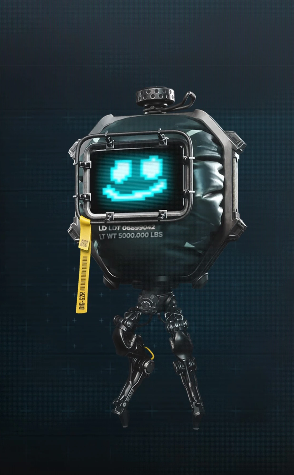 D1G-g2r is similar to various supply drones that EVE encounters on her adventure, though this one has a dark green storage bag with a small monitor displaying various rudimentary emoticons to represent D1G-g2r's mood. It has various screens, from a simple happy face, a waving hand, a curious hand, and an X when distressed. It also has a yellow tag with its name on it.